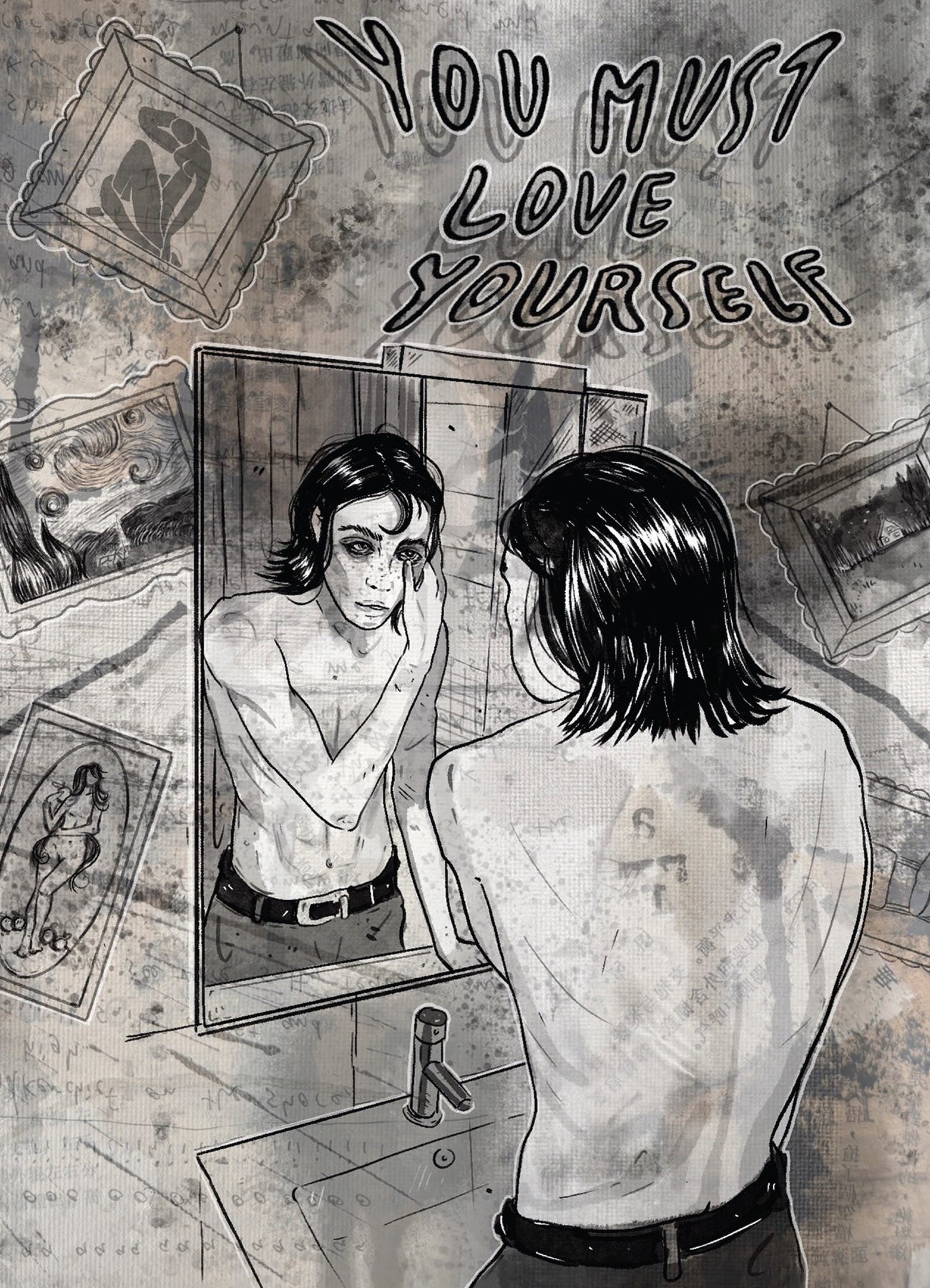 The first thing I see, upon regaining consciousness, is the reflection of my pale face in the mirror. Though it is not quite my face. The bags beneath my eyes are pronounced enough to be mistaken for bruises. My beard is gone, exposing a film of ashy skin stretched taut around bone, leaving none of my skeleton to be imagined. The swollen creases of my brain squeeze my temples, pushing my eyeballs out past their sockets. It is not a bathroom I have woken up in before. Since I am hovered above the sink and the tap is running, I proceed to rinse my face. On the way out I pass a urinal containing a pool of stagnant, ochre-coloured piss, which I hurriedly flush away.
