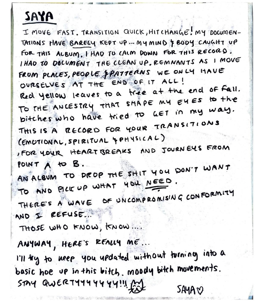 It’s a good day to write about Saya Gray since her forthcoming album, SAYA, is set to release in two weeks, February 21st. The album’s singles — 2 out of 3 which I have on repeat (SHELL (OF A MAN), LIE DOWN) — suggest it will be more approachable than Gray’s past projects, which have leaned abstract and experimental. The press notes for SAYA claim it to be the result of “sanding and fine-tuning the rough edges of records past into more cohesive works”.