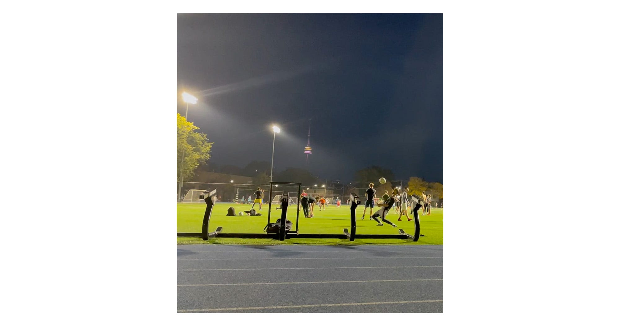 Doing pull-ups at the outdoor gym beside the high school, trading sets with a disheveled man who’d already crushed three Labatt 50s during his workout, which mostly consisted of dangling from the bar with a wet cigarette between his lips. I’ve always had a soft spot for this place. The motley crew of muscular bodies, goth kids by the bleachers, speakers fighting for air space, and chatty throngs of middle-aged women speed-walking the track, contained a social fabric that made me sorry for my hours spent in a mirror-lined room, wearing noise-cancelling headphones and clean sneakers, pursuing a vanity project that mattered to no one. Here it felt, however marginally, that I was participating in the world. The school’s clock tower loomed over the track, reporting the same hour it had all summer. Here was the worst school in the inner city, according to the Toronto District School Board; a ranking that seemed unworthy of the dialogue occurring between its stately façade and the neighbourhood, best embodied by the woman twerking against a soccer net to a blaring Missy Elliott track, her ass pointed at the unfazed monument.