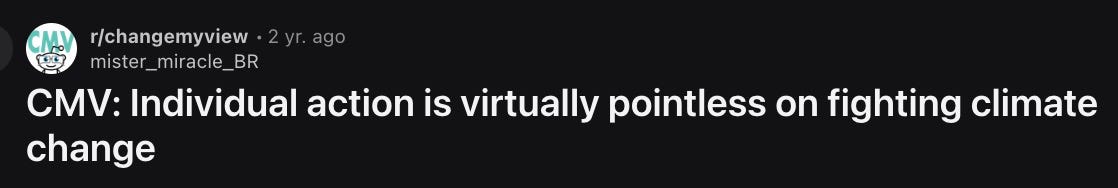 This is more of an anecdotal / vibes argument than a structural one, but people calling for behavioural change tend to be highly sensitive to this (I know I am). I think, resultantly, many play the victim card against those who diminish them, oppose their view, or choose not to match their efforts. Let’s be clear: none of us have the right to claim victimhood of climate change. Even for those who manage to exhibit zero-harm behaviour, placing oneself within the tragedy of nature is deplorable. No one wants to hear about it.