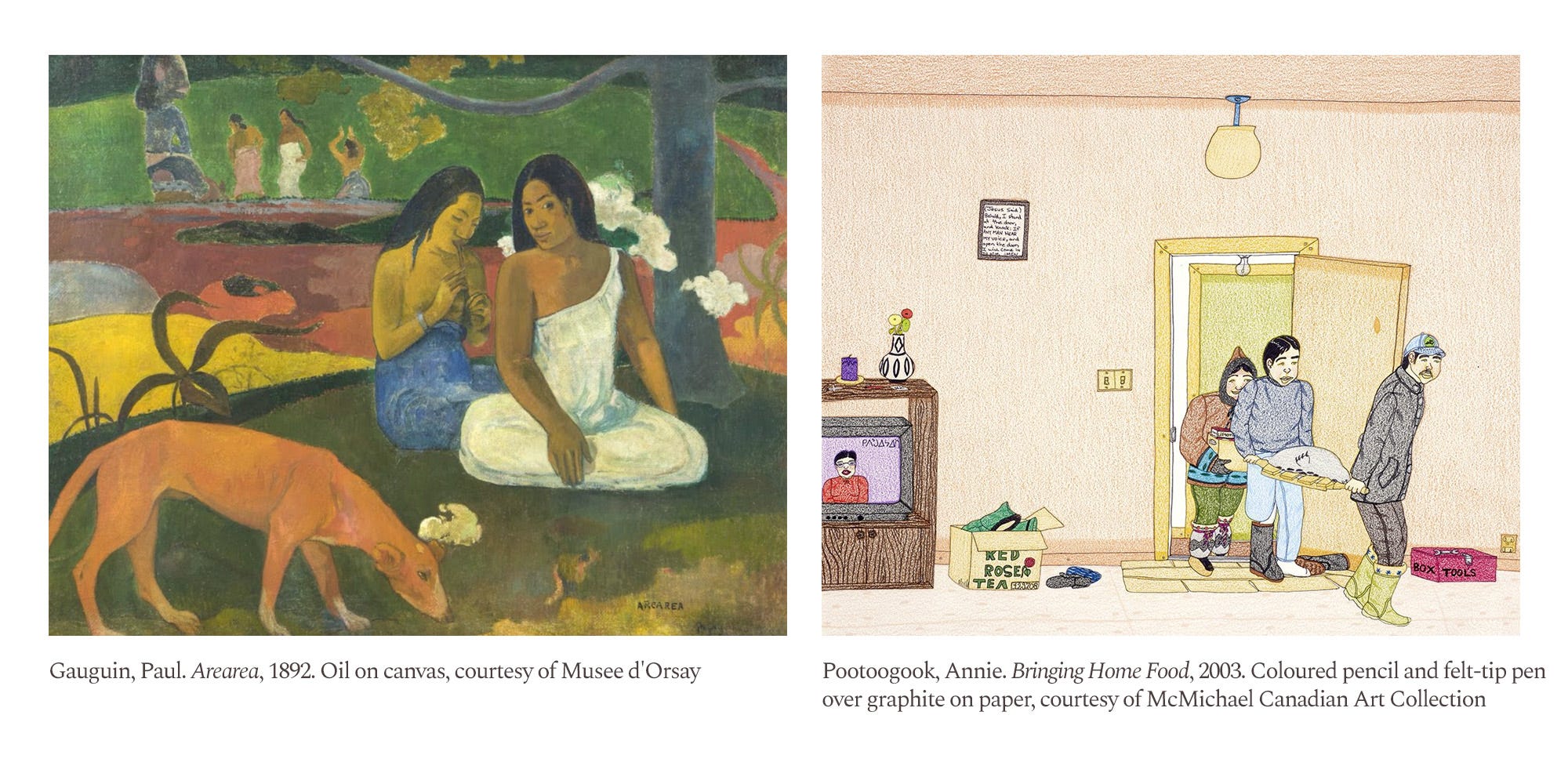 Romanticizing discomfort from an ivory tower while lots of people live in struggle has the leering quality of Gauguin’s primitivism, or the pompous utopianism of Captain Fantastic. Annie Pootoogook’s portraits of life in Kinngait, conversely, observe a “degrowthed” reality with neither a cynical sneer nor hyperbolic romance: sparse living (with key comforts), a harsh interface with nature, sharing resources rather than individual excesses. There is plenty of hardship, but perhaps also a sense of community and spiritual well-being.