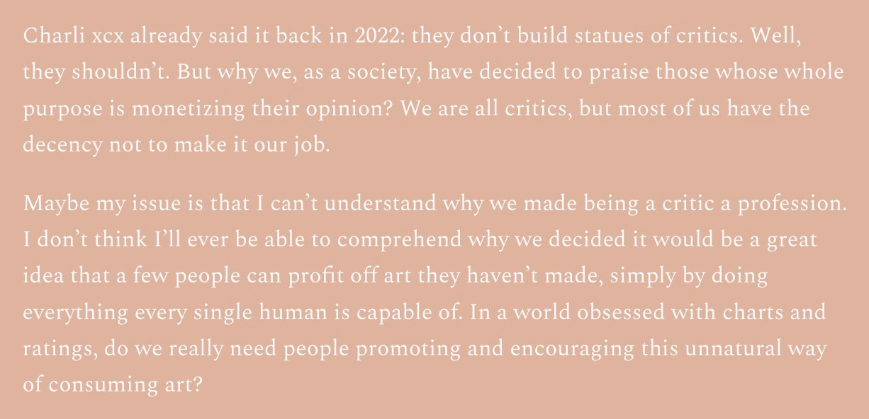 I’m not interested in picking apart this one post or starting a fight with one internet stranger. But the algorithm has served this tired take often enough to convince me that it’s a trending sentiment; now I must do the algorithm’s bidding by weighing in. In the populist fashion du jour, Carm’s post and others like it present a plausible villain (professional critics) as the culprit for a nebulous, but perhaps real issue (that individuals are increasingly not thinking about and relating to art for themselves). And despite Carm’s being the category of shallow criticism algorithms tend to reward—the very same type of criticism she takes issue with—I’m grateful she expressed her opinion and prompted this rabbit hole of reflection. That’s what criticism is all about!
