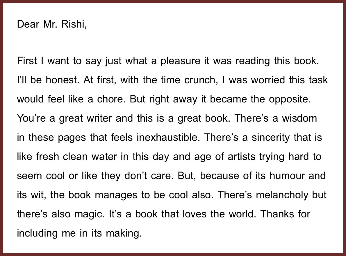 In other news, here is a snippet of feedback from my friend, and most trusted reader, after reviewing my debut story collection (Anvil Press, June 2026). Can’t wait to share it with you all.